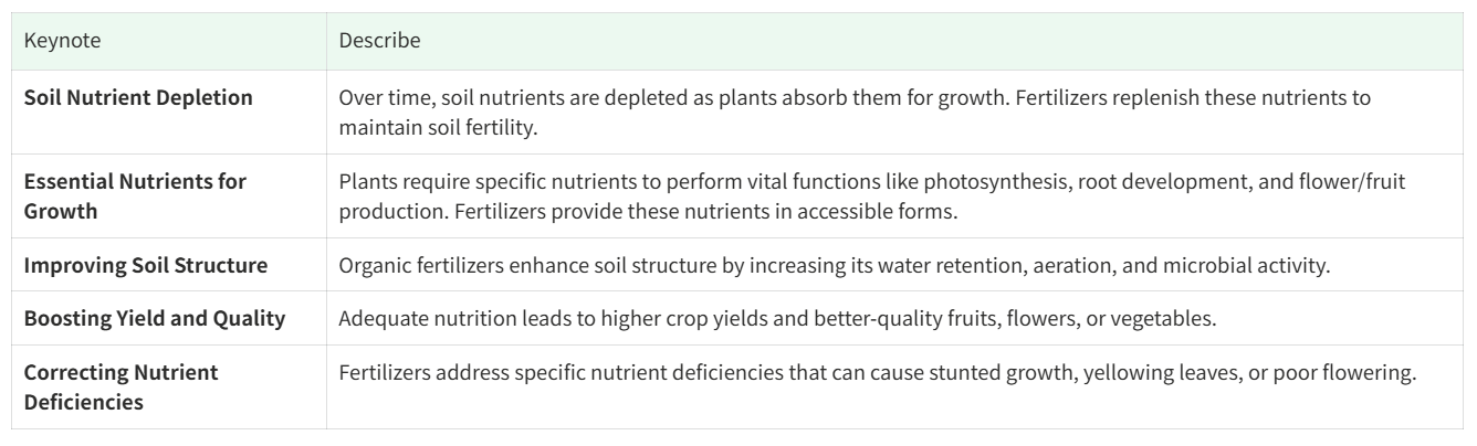 Plants need fertilizers to ensure they receive essential nutrients for healthy growth, development, and reproduction. Here’s a detailed explanation: